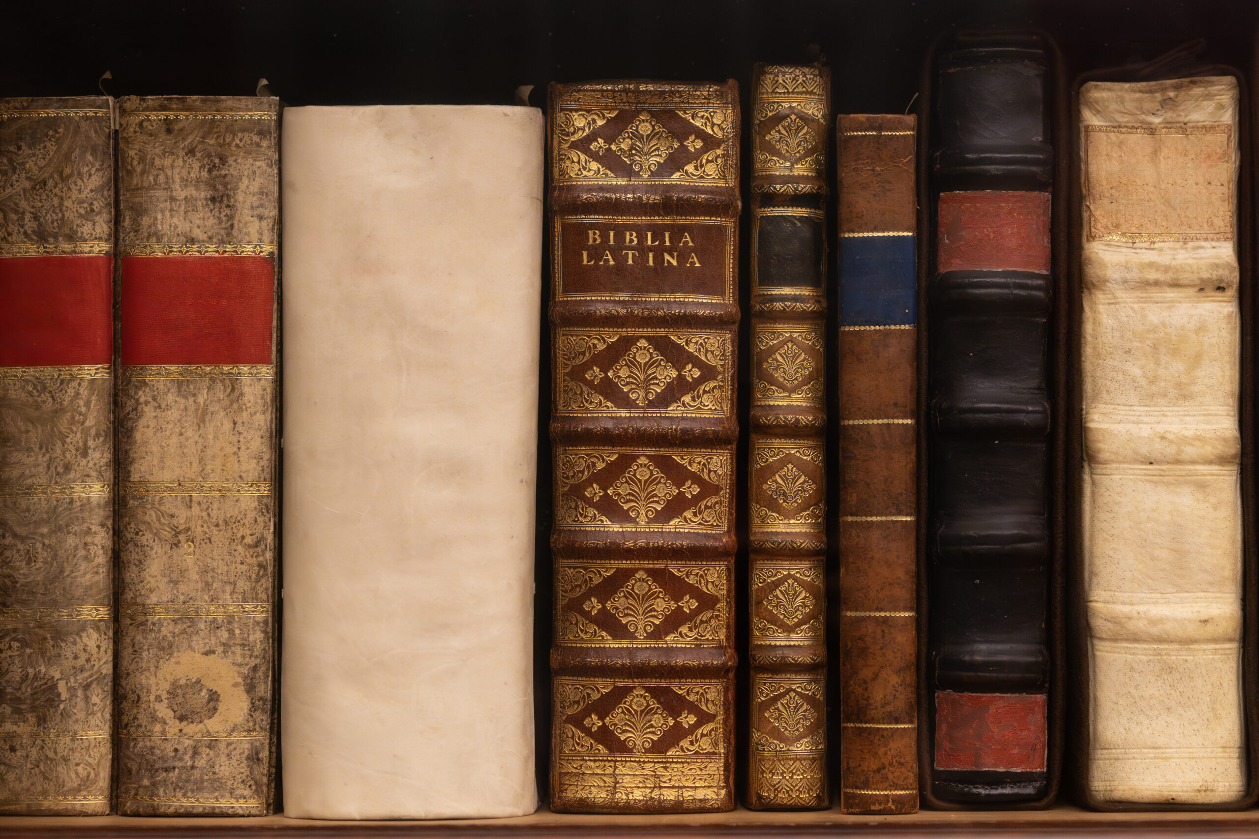 Row of vintage books with ornate bindings and titles